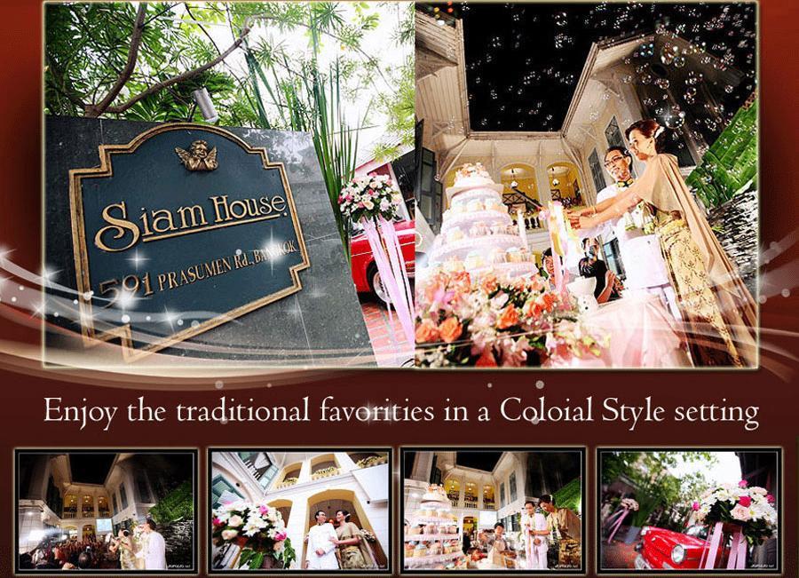สยามเฮ้าส์กรุ๊ป สถานที่จัดงานแต่งงานในรูปแบบที่ไม่เหมือนใคร ไม่ว่าความต้องการของคุณจะเป็นในลักษณะแบบไทยประยุกต์กับบ้านตึกสไตล์โคโลเนี่ยน สมัยรัชกาลที่ 5 หรือไทยแท้ๆสมัยอยุธยา พร้อมกับบรรยากาศบึงน้ำและสวนสวยในพื้นที่กว่า 5 ไร่หรือหากคุณต้องการจัดงานแต่งงาน ในรูปแบบวิลล่า อาคารตึกประดับหิน พร้อมสวนยุโรป