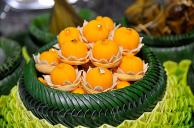 1.ขนมทองหยิบ เป็นขนมที่มีลักษณะงดงามคล้ายดอกไม้สีทอง ชื่อขนมทองหยิบเป็นชื่อสิริมงคล เชื่อว่าหากนำไปใช้ประกอบพิธีมงคลต่าง ๆ หรือให้เป็นของขวัญแก่ใครแล้วจะทำให้เกิดความมั่งคั่งร่ำรวย หยิบจับการงานสิ่งใดก็จะร่ำรวยมีเงินมีทอง สมดังชื่อ "ทองหยิบ"