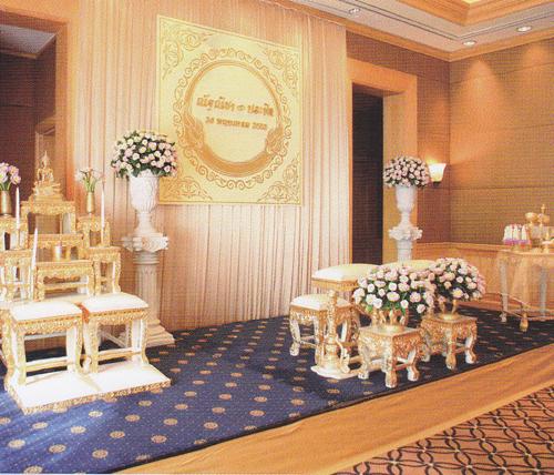 ชุดหลั่งน้ำพระพุทธมนต์ ประกอบด้วยพวงมาลัยบ่าวสาว แป้งเจิม มงคลแฝด พานวางหอยสังข์ ชุดตั่งหรือถ้านั่งพื้นสามารถใช้พรมรองนั่งได้ หมอนรองมือ พานพุ่มดอกไม้สำหรับรับน้ำสังข์ ของชำร่วย และดอกไม้ประดับ 2 ข้าง เพื่อความสวยงาม